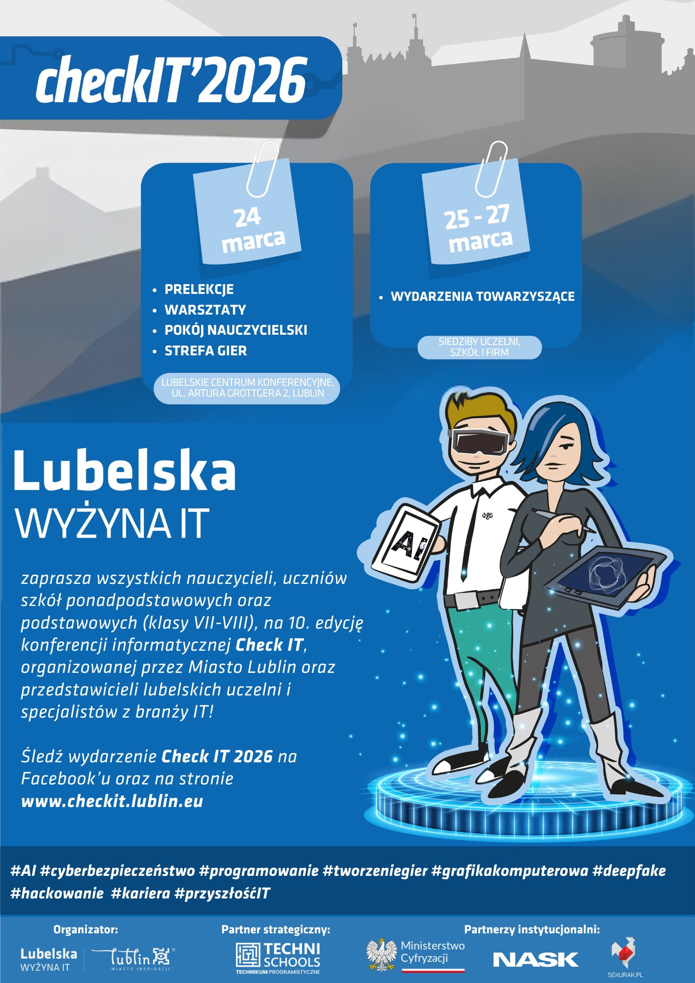 Serdecznie zapraszamy uczniów oraz nauczycieli do udziału w dziesiątej, jubileuszowej edycji bezpłatnej konferencji informatycznej „Check IT”, która odbędzie się 24 marca w Lubelskim Centrum Konferencyjnym w Lublinie. Wydarzenie organizowane jest przez Wydział Strategii i Obsługi Inwestorów Urzędu Miasta Lublin w ramach inicjatywy Lubelska Wyżyna IT.